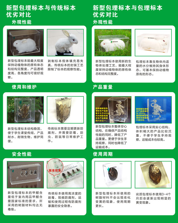新型包埋標(biāo)本的特點(diǎn) ◆輕盈便攜、透明直觀:產(chǎn)品為空心結(jié)構(gòu),輕便易觀察。 ◆安全環(huán)保、自然真實(shí):使用包埋材料和封裝材料環(huán)保安全。先進(jìn)的動(dòng)植物干燥處理工藝,不破壞動(dòng)植物的原有的整體結(jié)構(gòu),更完整,更逼真。 ◆長(zhǎng)久保存、性價(jià)比高:高分子材料滲透包裹處理,更經(jīng)久耐用?招慕Y(jié)構(gòu)降低產(chǎn)品的重量,性價(jià)比更高。 |