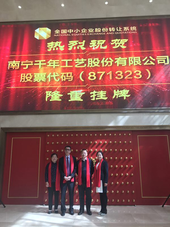 2017年5月5日,在北京金融街金陽大廈內(nèi),隨著開市寶鐘的敲響,南寧千年工藝股份有限公司(企業(yè)簡稱:千年工藝,股份代碼:871323)在全國中小企業(yè)股份轉(zhuǎn)讓系統(tǒng)成功掛牌上市,成為廣西首家正式登陸新三板資本市場(chǎng)的工藝制造企業(yè),這是總公司在發(fā)展進(jìn)程中的一個(gè)重大里程碑!